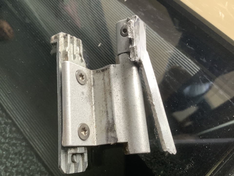 Door het gewicht van de beglazing was het oude onderscharnier langzaam gaan vervormen. De deur hing scheef en sloot niet meer goed aan in de rubbers, met tocht en slijtage als gevolg. François verwijderde het bestaande beslag, bracht een nieuw scharnier aan en stelde de deur zorgvuldig af.